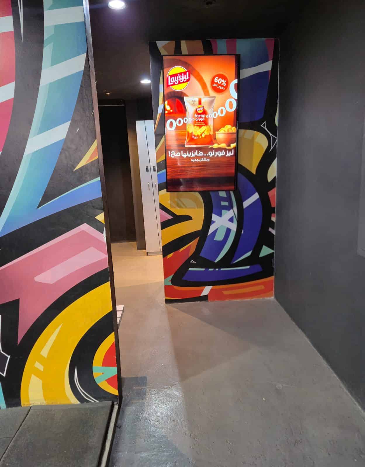 Screens are distributed at strategic points inside: